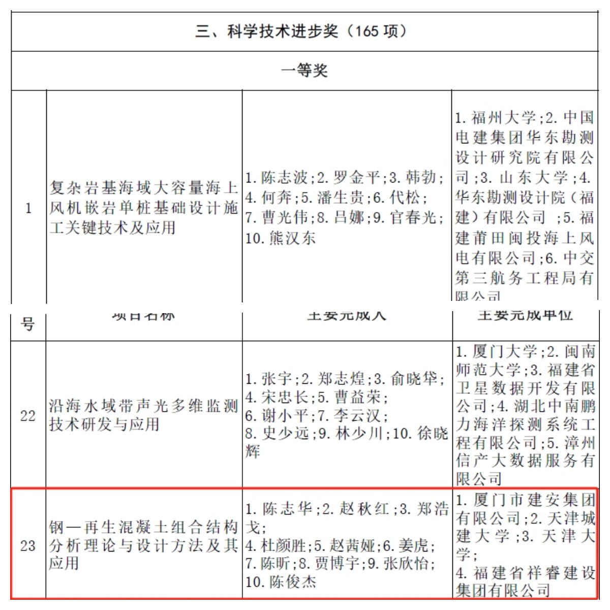 日前,福建省人民政府正式公布了《福建省人民政府關于2023年度省科學技術獎勵的決定》,廈門市建安集團有限公司研發(fā)課題《鋼—再生混凝土組合結構分析理論與設計方法及其應用》榮獲福建省科學技術進步獎一等獎!